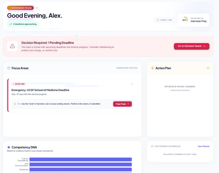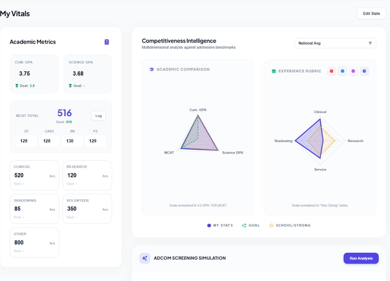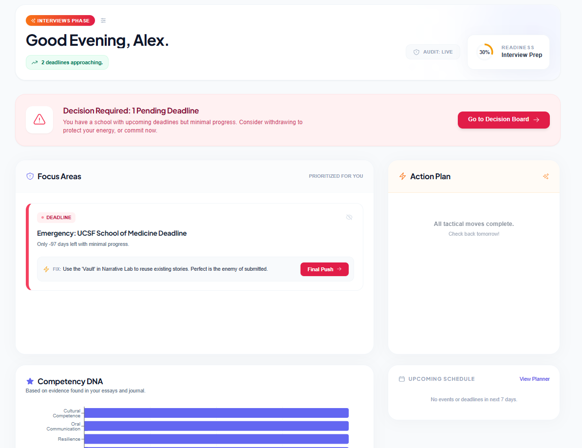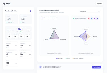 Ditch the scattered spreadsheets. MedPath organizes your tasks, refines your essays, and highlighting exactly what to focus on today.