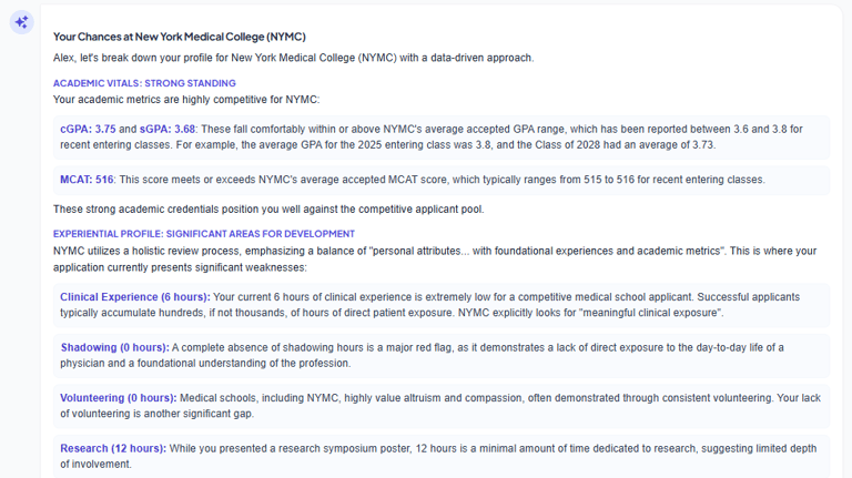 Chat with an AI assistant that understands your specific stats, hours, and target schools to get thoughtful, data-backed answers.